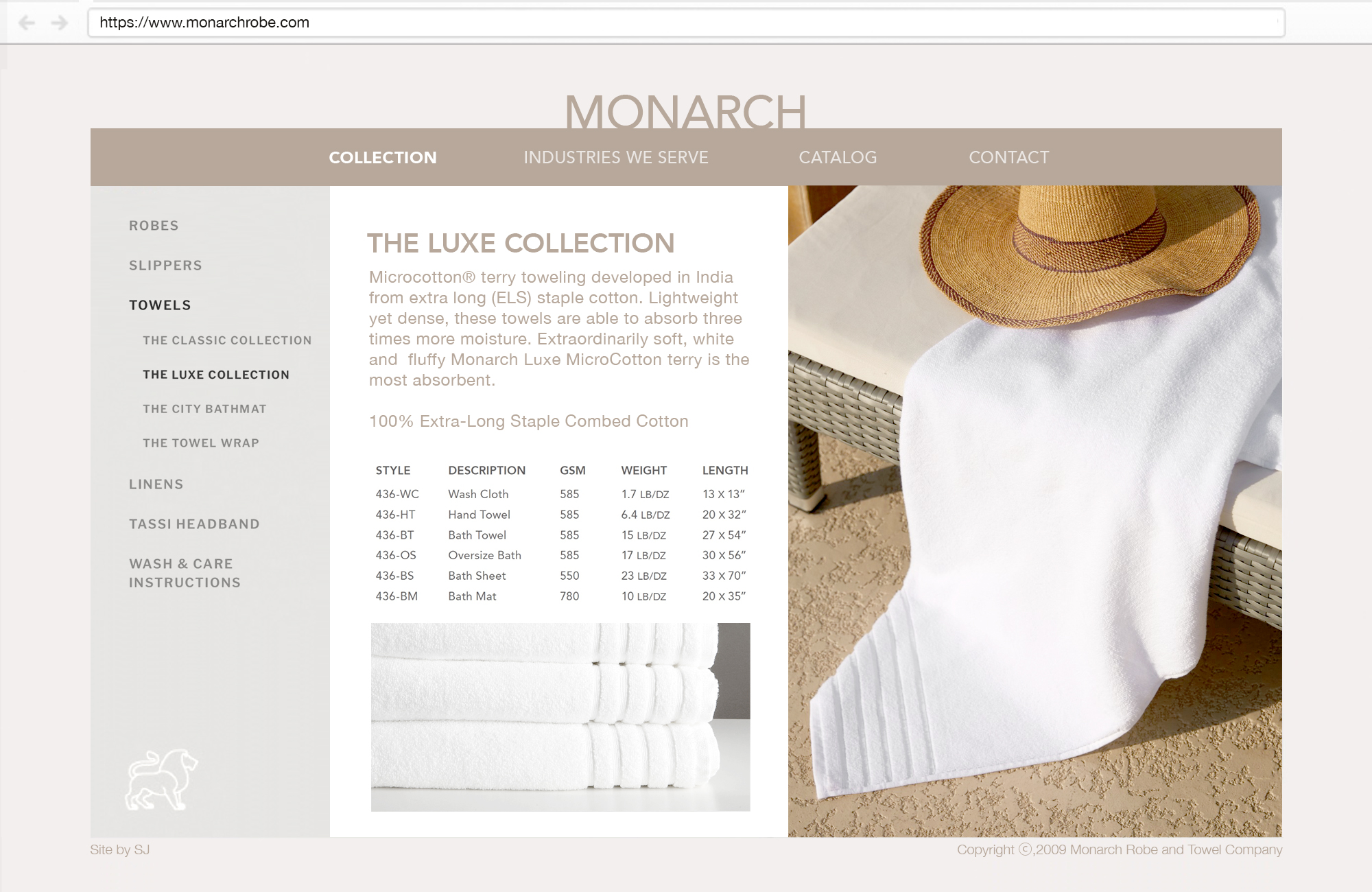 Monarch Robe'Monarch' was founded in 1981. The company has earned a staunch reputation for providing the finest quality products to many of the most prestigious hotels, resorts, spas, and cruise lines around the world, as well as medical, corporate, and consumer retail markets. I was the design leader for the website and brochure of ‘Monarch’.