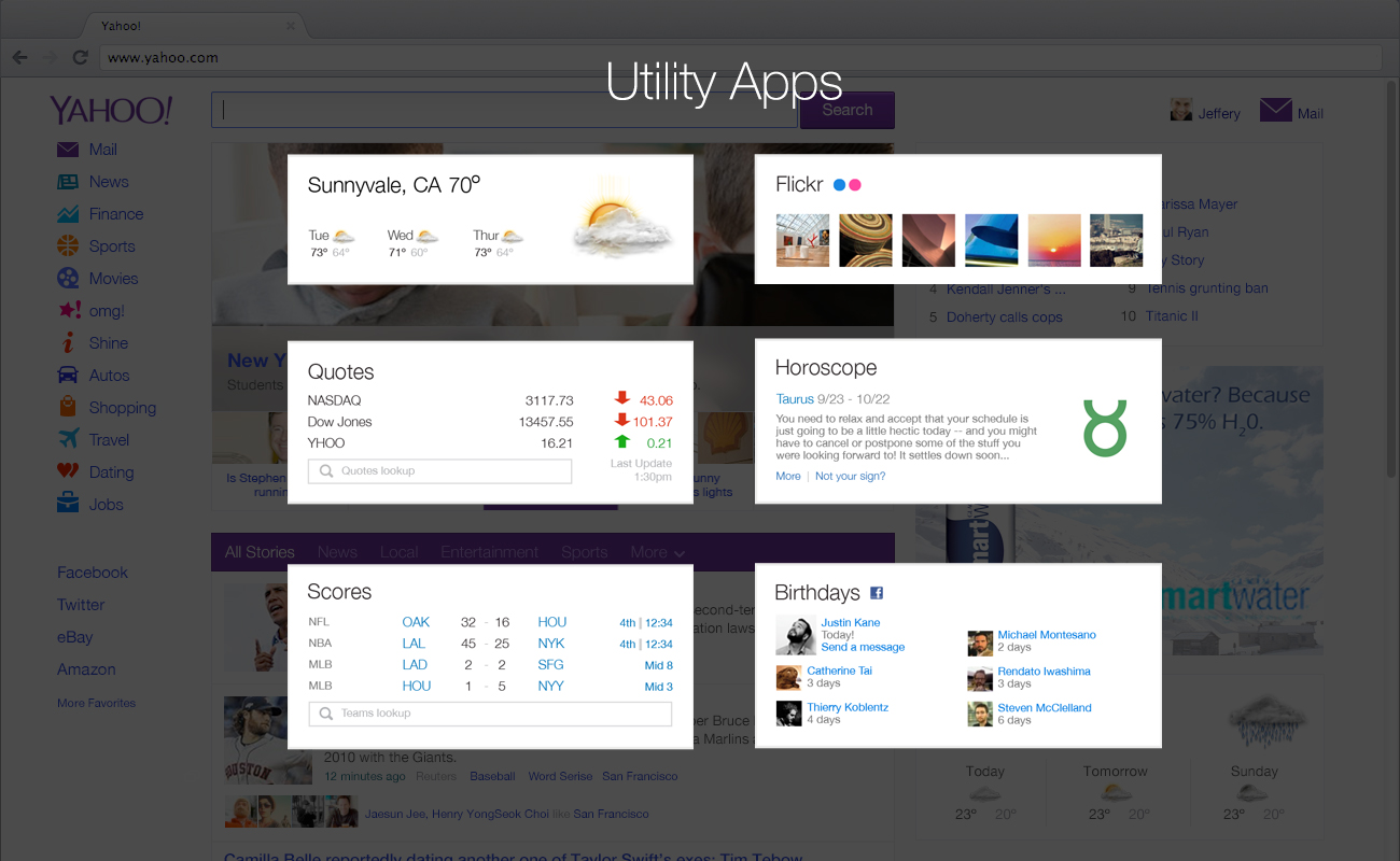Yahoo's revamped home page isn't a radical new look. However, we optimized it across various mobile devices, and there are enough changes that could make the website more addictive. The most significant switch will be how Yahoo determines which stories to show each visitor on the home page and how the information is displayed. Yahoo has developed more sophisticated formulas to determine which topics are most likely to appeal to different people so the news feed can be fine-tuned to cater to different tastes.The right side of the new home page was devoted to modules that call "Utility Apps." The modules have been configured for weather, finance, sports, friends' birthdays, video clips, and Yahoo's Flickr site for photos. Each one can be programmed to automatically show what a user wants to see, such as the weather in a specific city, information about certain sports teams, or the stocks in an individual's investment portfolio.