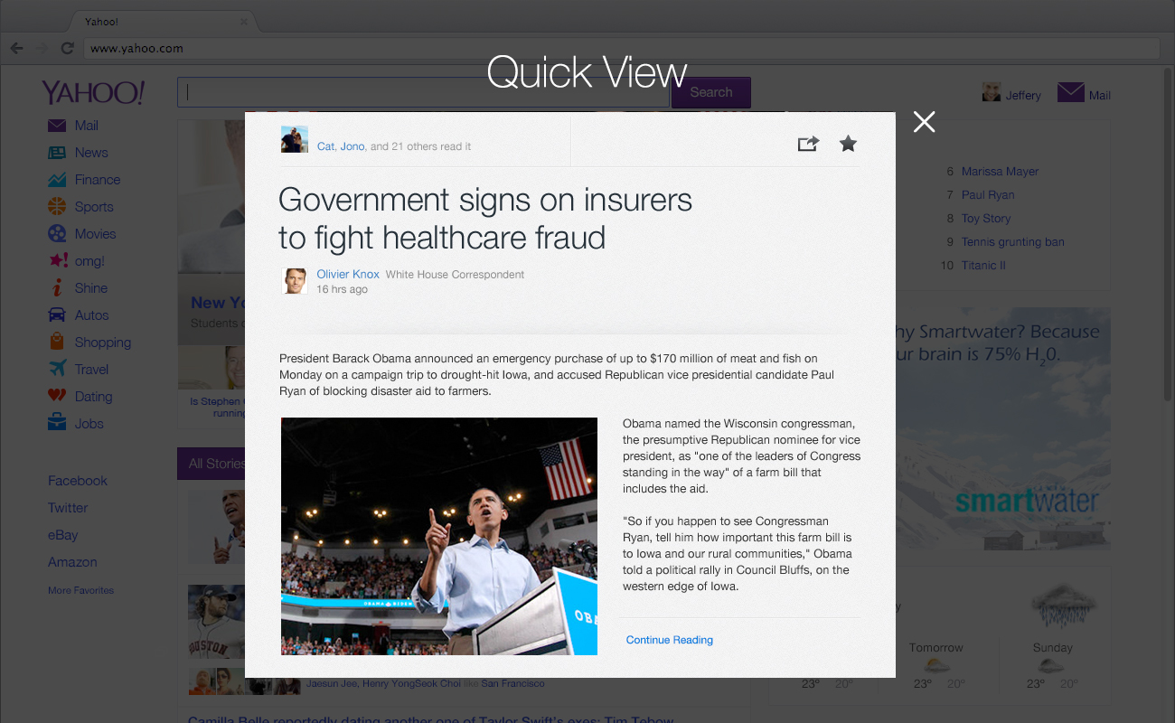 Yahoo's redesign in four years was all about hitting users' interests and preferences, establishing more of the company's services as daily habits that "delight and inspire" users, and providing users with a more tailored and social experience in hopes they'll linger on the site. For that, the revamped homepage includes a customizable newsfeed with an infinite scroll. Users can make their experience more social by logging in with their Yahoo or Facebook ID, which will serve content shared by friends. As well as allowing you to specify topics of interest to display and see news shared by your friends. Users can share content on the page via e-mail, Twitter, or Facebook.